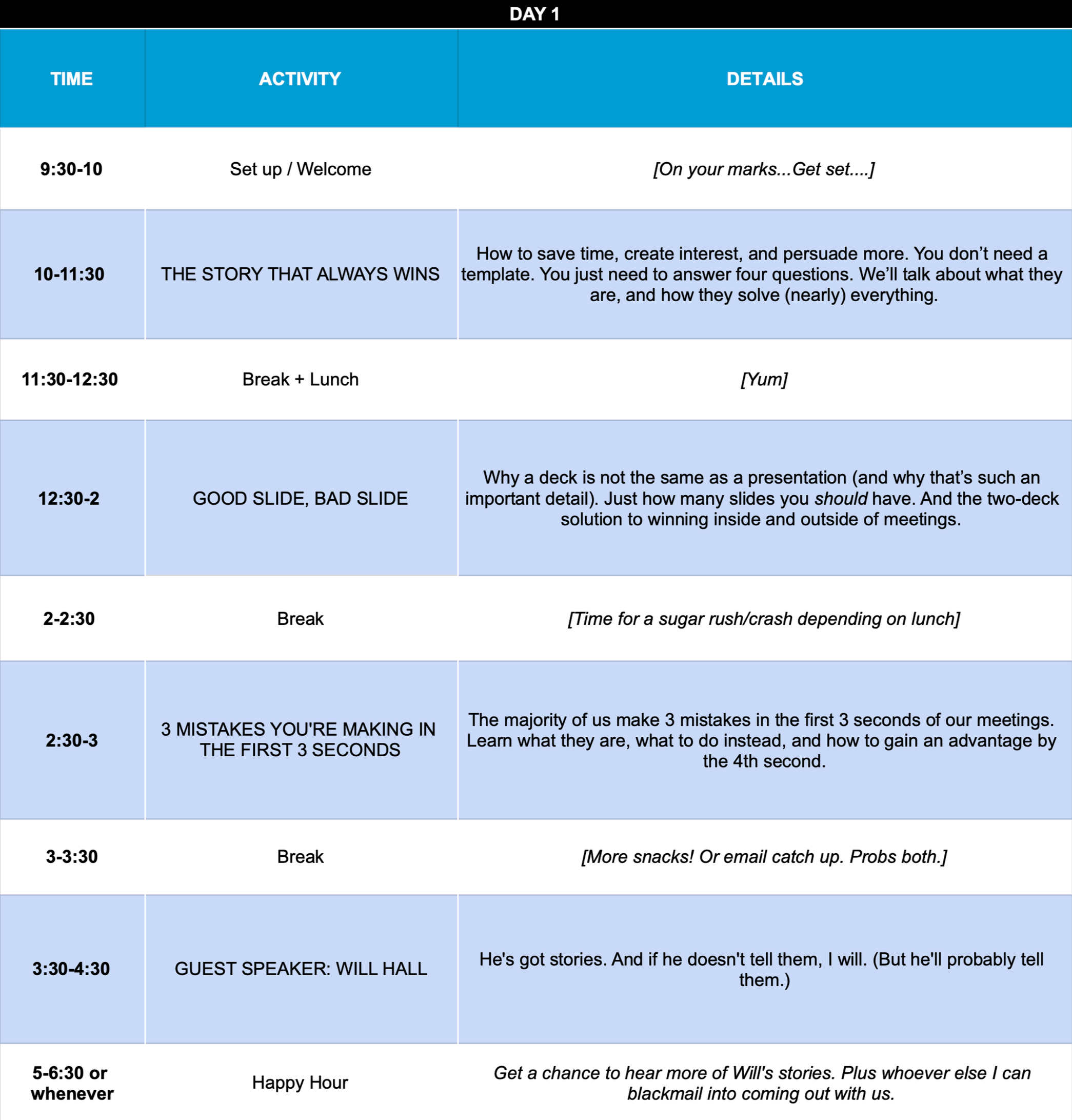 I’ve already told you there’s only 30 seats. I’ve shared that you’re getting basically everything I offer in two days. I even shamelessly name-dropped in the image captions.